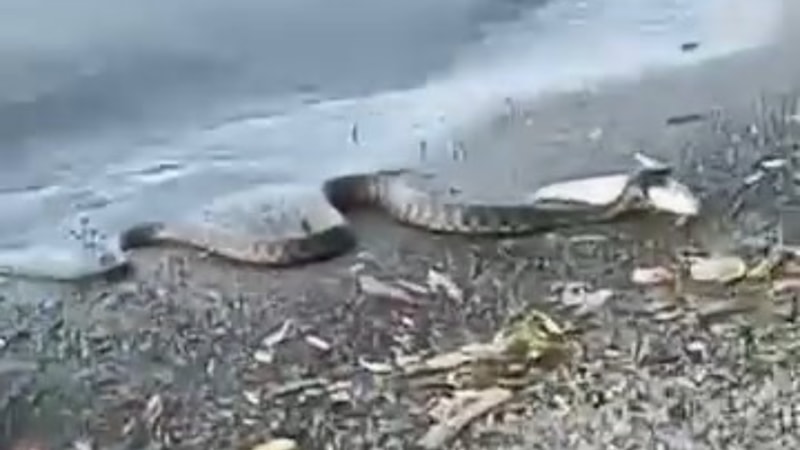 Hazar Gölü'nde bir yılan, avladığı balığı yemek için kıyıya çıkardı.