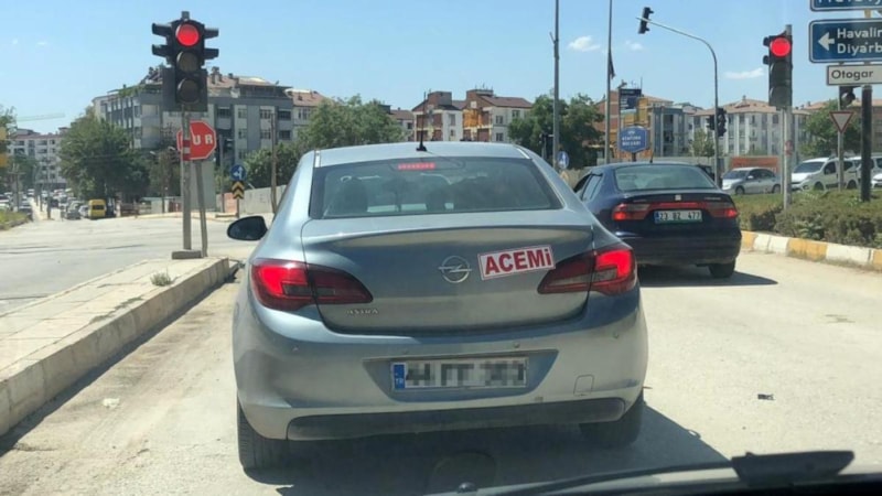 Elazığ'da bir sürücü, aracının arkasına büyük puntolar ile ‘acemi' yazısı yapıştırıp, trafiğe çıktı.