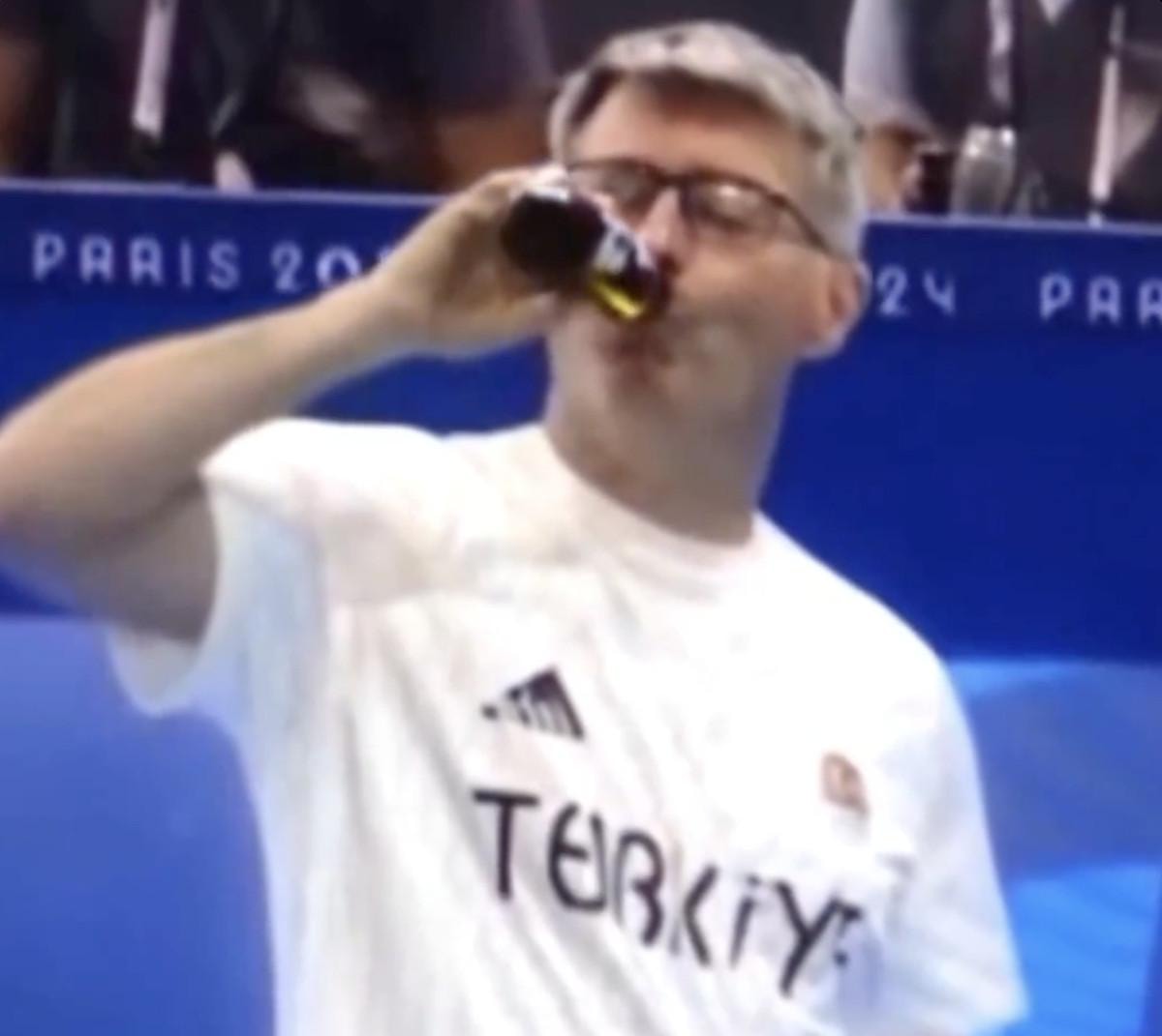Yapay zeka teknolojisi ile yapılan videoda Yusuf Dikeç, gümüş madalya kazandığı atışının ardından cam şişedeki içeceğini yudumluyor.