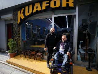 Dükkanın girişine engelli rampası yaptıran Gündüz, tekerlekli sandalyesi veya akülü arabasıyla gelen müşterilerini yerinden kaldırmadan, hidrolik sistemli ayarlanabilir platform sayesinde saç ve sakalını kesiyor.