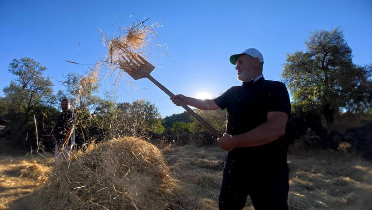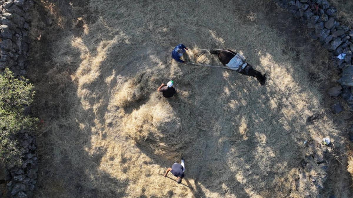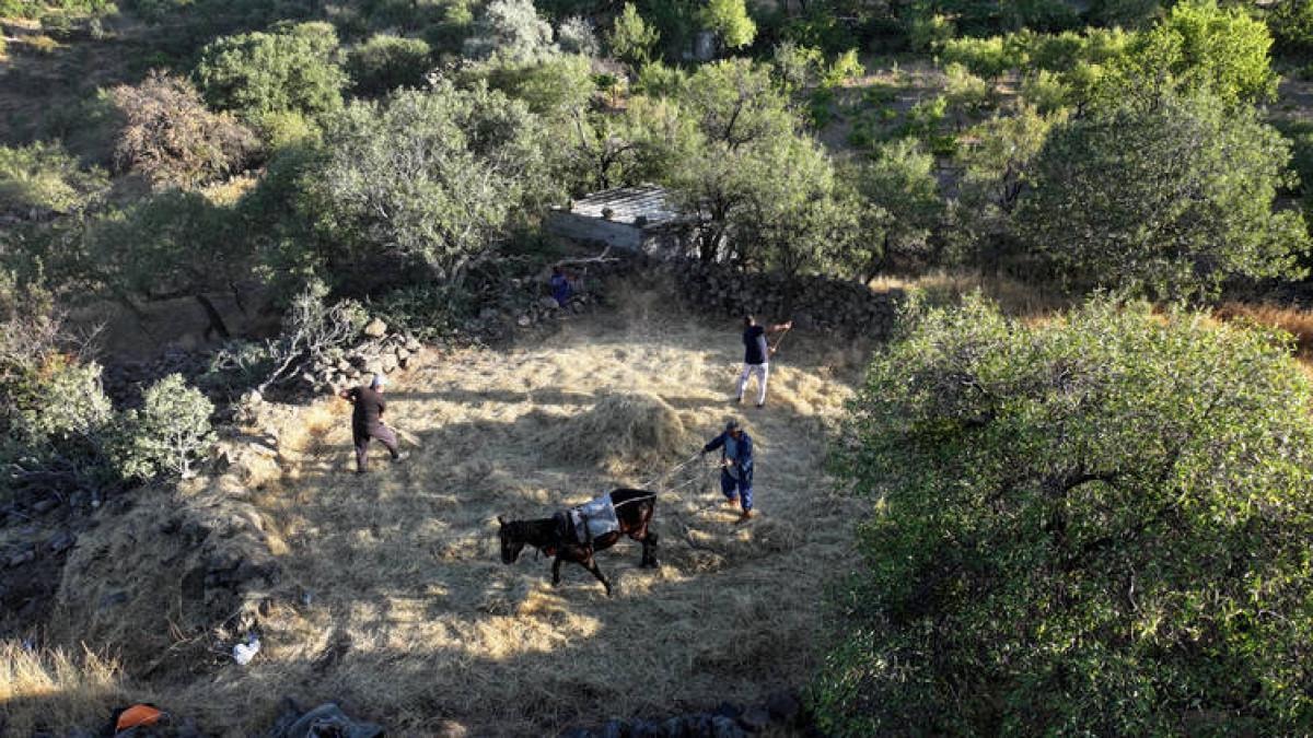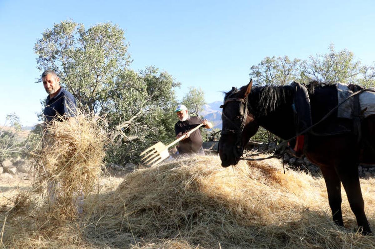 Arkadaşlar, tarladan topladıkları sapları atlarla harmana taşıyarak, alt yüzeyinde keskin çakmak taşları bulunan kızak biçimindeki düveni kullanıyor. Baktır, bu sayede geçmiş hatıraları yeniden canlandırdıklarını belirtti: