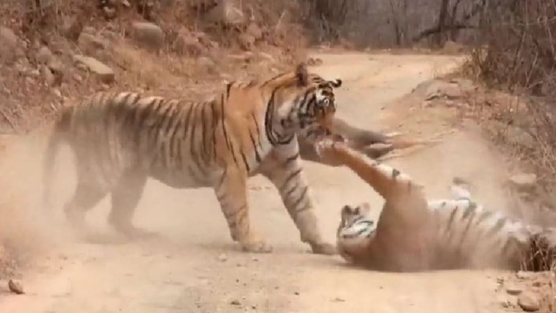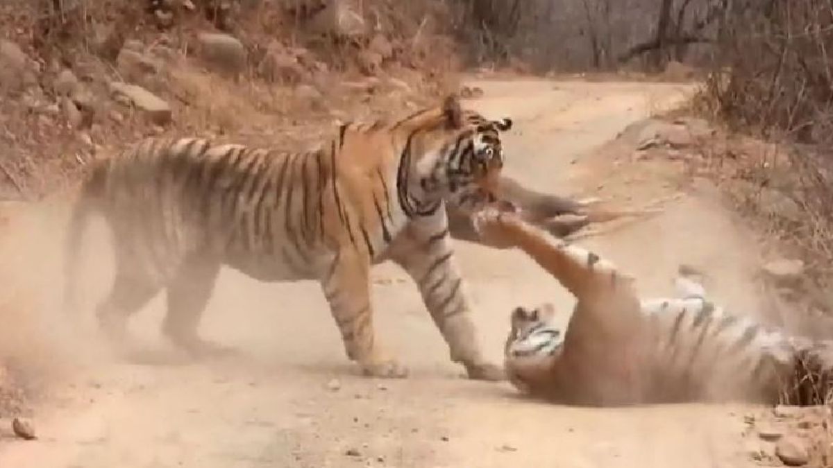 Parkta olup biteni gözleyen gezginler, bir av ve iki kaplanın kıyasıya mücadelesine şahit oldu.