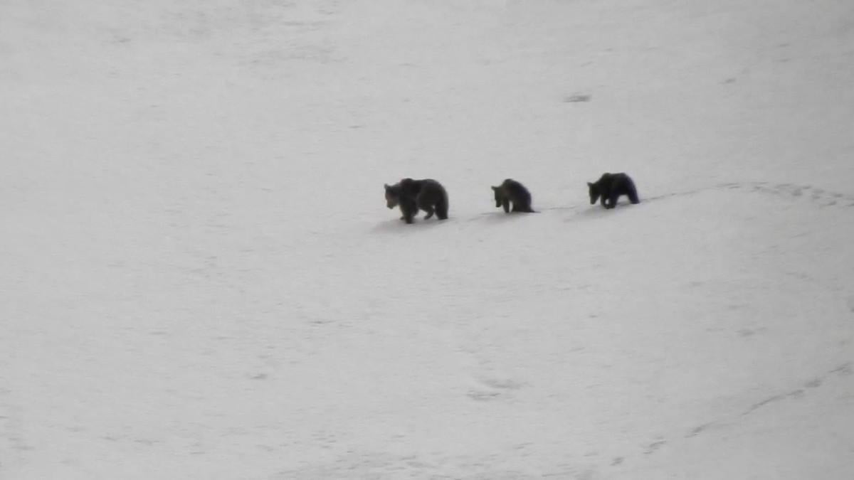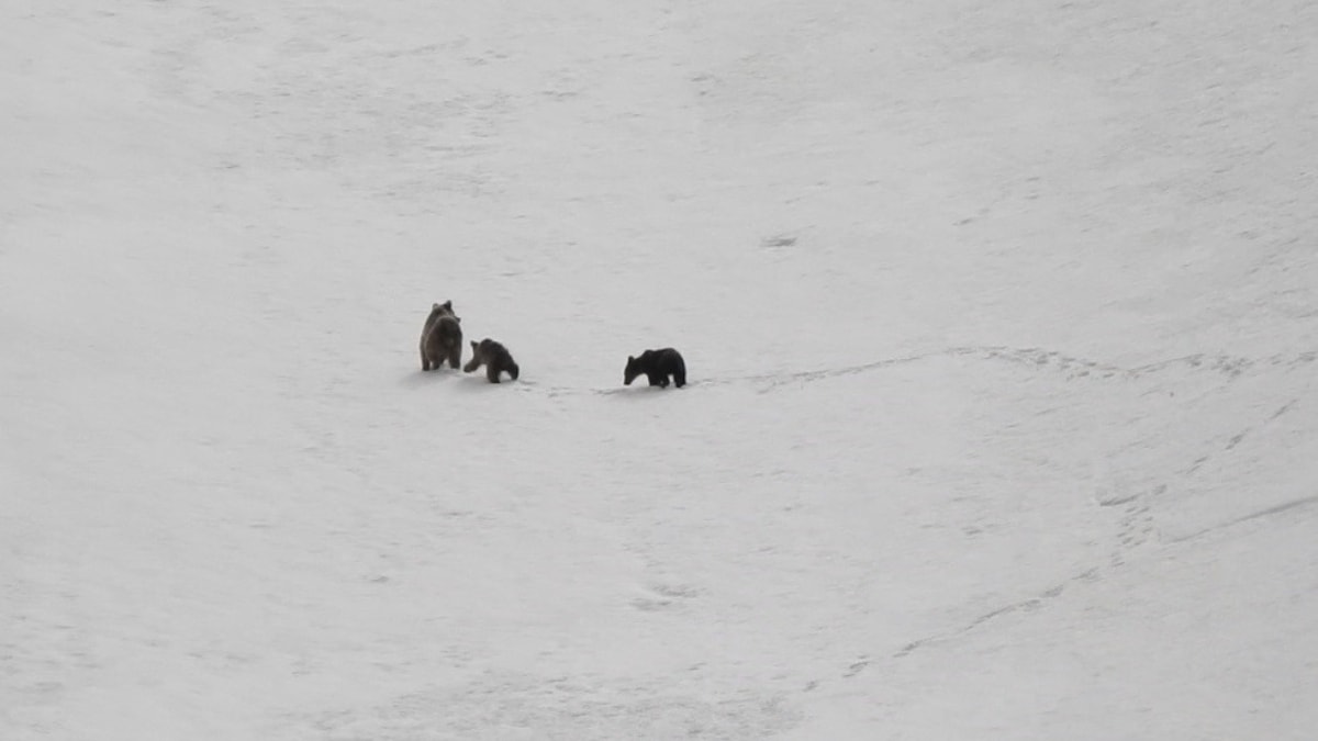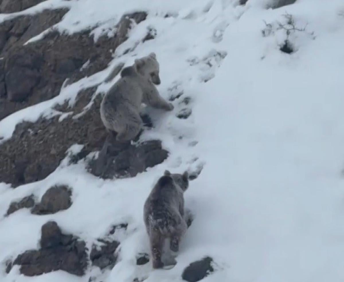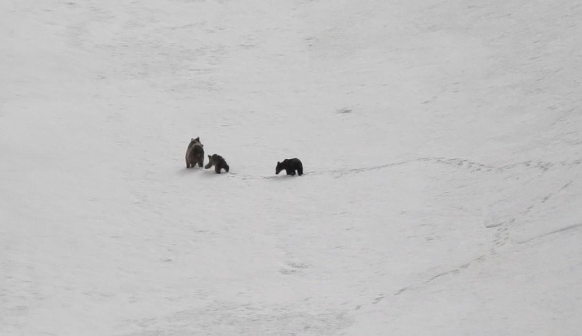 Karla kaplı dağın yamacında büyükçe iki ayının birbiriyle adeta güreşmesi ve bir anne ayının iki yavrusuyla yiyecek araması görüntülerde yer aldı.