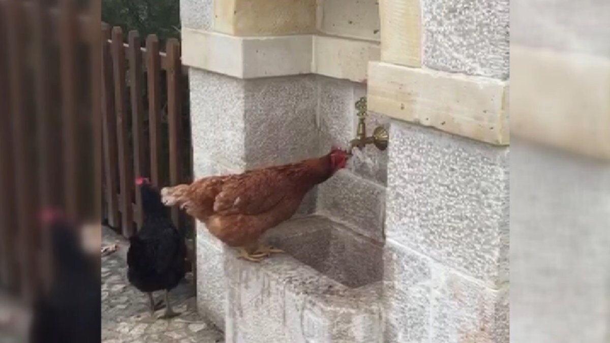 Çeşmenin musluğundan akan sudan içerek susuzluğunu gideren tavuk görenlere tebessüm ettirdi. O anlar cep telefonuyla bir vatandaş tarafından kaydedildi.