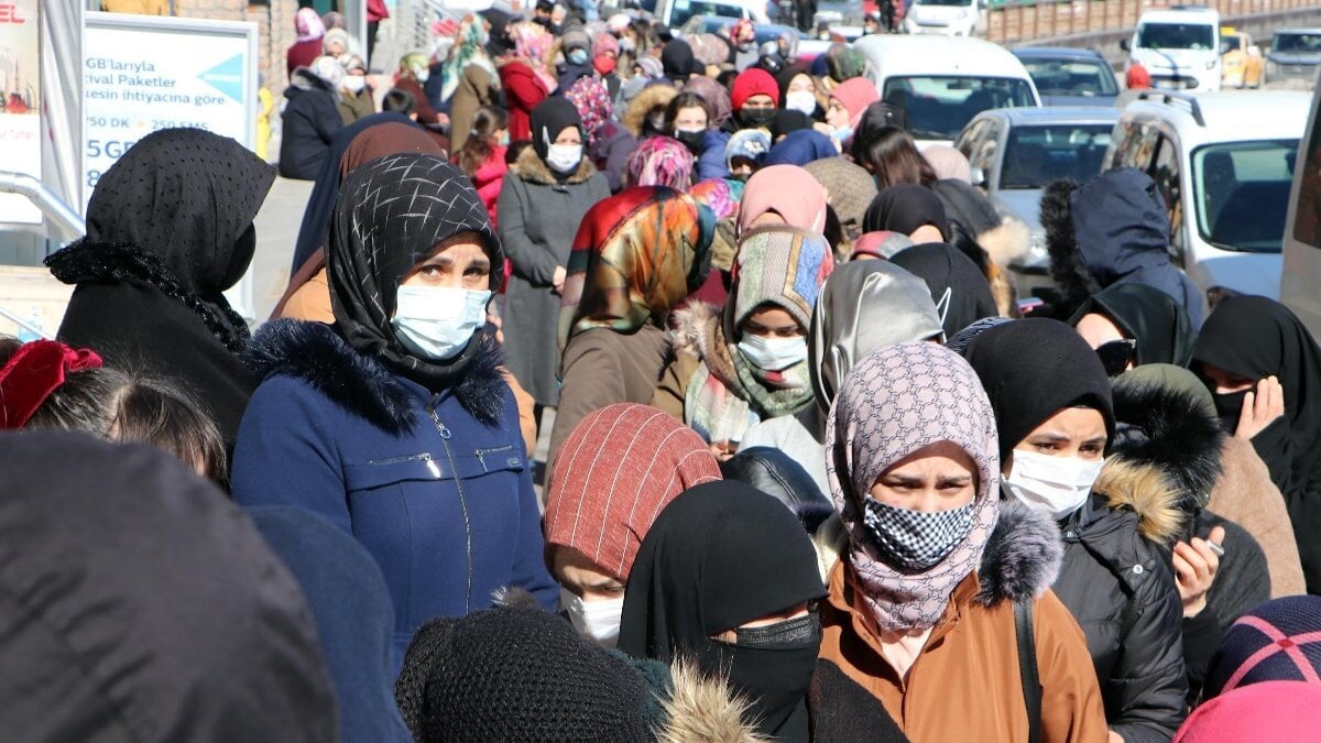 Koronavirüs vaka sayılarının bazı bölgelerde artmasına rağmen sabah erken saatlerde, iş yeri önünde çoğu kadın onlarca kişi toplandı.