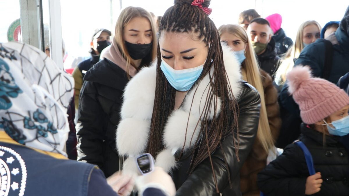 Uçaktan inen Ukraynalı turistler ateşleri ölçüldükten sonra pasaport işlemine alındı.
