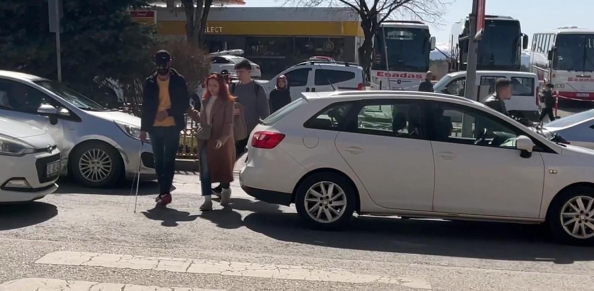 Görme engellilerin kullandığı baston ve gözüne taktığı gözlükle yolun karşısında bekleyen Arifoğulları'na, ilk olarak yaya geçidinde duran trafik polisi yardımcı oldu.