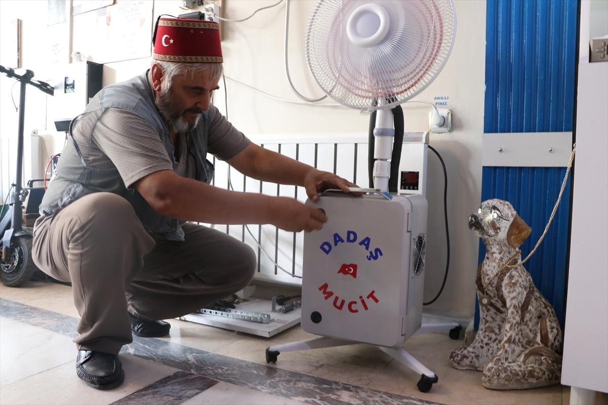 Elektronik işlerle 50 yılı aşkındır çalıştığını ifade eden Taşbaşı, "Öncelikle vantilatörün arkasında gaz geçiş borusu döşedik. Boruları soğutması için kompresör entegre ettik. Yani buzdolabı malzemesi kullandık. Soğukluk dijital termostattan ayarlanabiliyor. Oldukça da ekonomik." dedi.