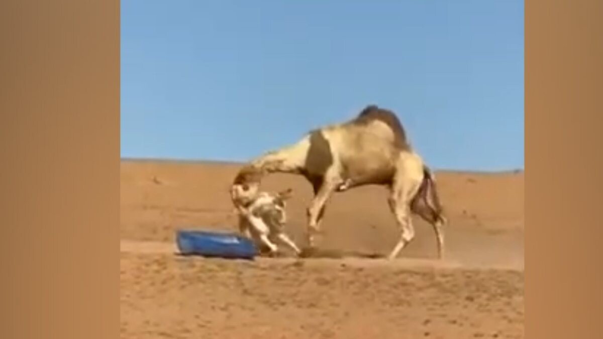 Çöl ortasındaki bir deve ile eşeğin kavgaya tutuştuğu anlar görüntülendi.