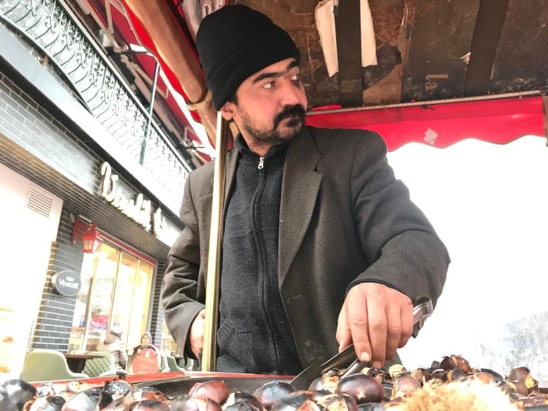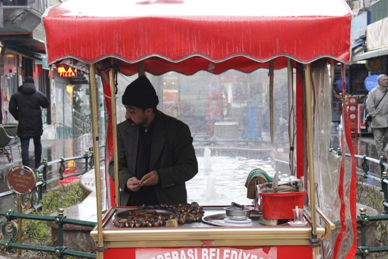 Zihinsel engelli ve epilepsi hastası kestaneci, zaman zaman bayılmasına rağmen tezgahını açıp ekmek parasını kazanmaya çalışıyor.