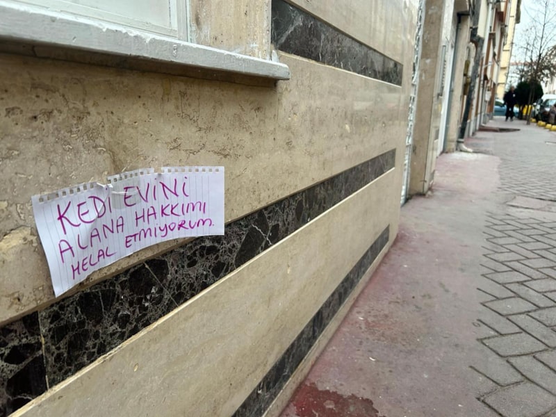 Vatandaş, kedi evinin önünde durduğu binanın duvarına, "Kedi evini alana hakkımı helal etmiyorum" yazılı kağıt yapıştırdı.