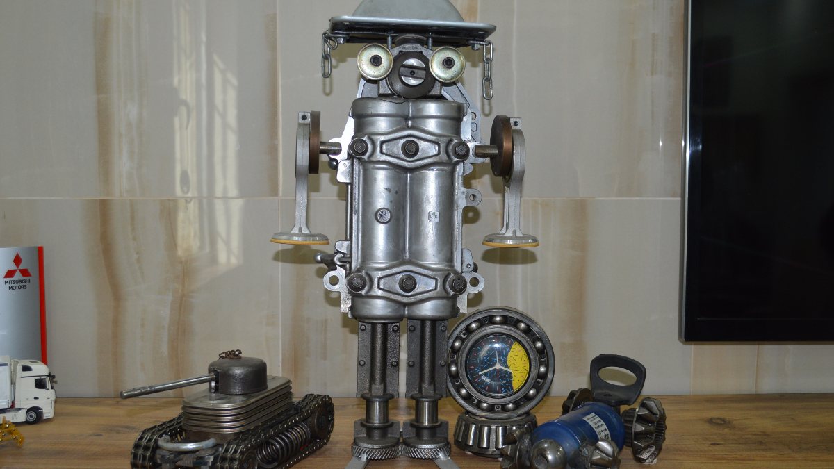 Bunlar bizim hobi çalışmamız. Stresimizi alıyor. Mesela bir traktör planladık, iki rulmanla bir saat ortaya çıkarttık. Motorun içinde bulunan parçayı robot haline getirdik. Araçların atık parçalarından tank yaptık, yine piston ve motor parçaları ile abajur yaptık. Lambaları yanıyor, gece de ışıklandırmaları var. Arkadaşlarımıza hediye ediyoruz. Tamirhanemizi güzel bir ortama dönüştürdük. Atıkları minimize etmeye çalışıyoruz."