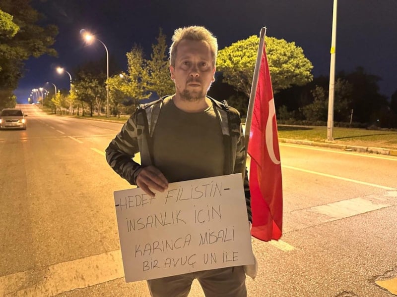 Yaklaşık 2 aydır planladığı yürüyüşe başlamadan önce dükkanını eşine emanet ederek ailesinden helallik alan Başkaya, 'Hedef Filistin, insanlık için. Karınca misali bir avuç un ile' yazılı pankartı, Türk bayrağı ve yanına aldığı bir paket un ile evinden ayrıldı.