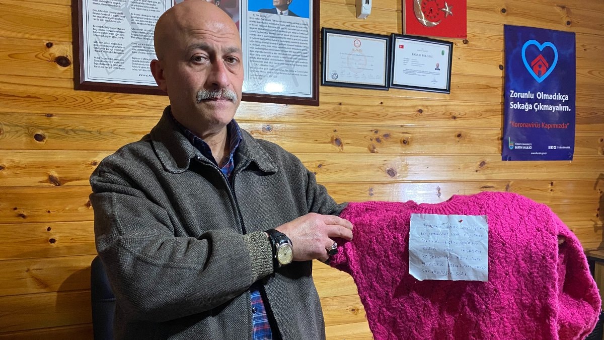 Bartın'ın Esentepe Mahallesi'nde muhtarlık görevinde bulunan Şenol Özdemir, valiliğe teslim etmek üzere ayrıştırdığı yardımları sınıflandırırken içinde el örgüsü çocuk kıyafetlerinin olduğu bir poşetle karşılaştı.