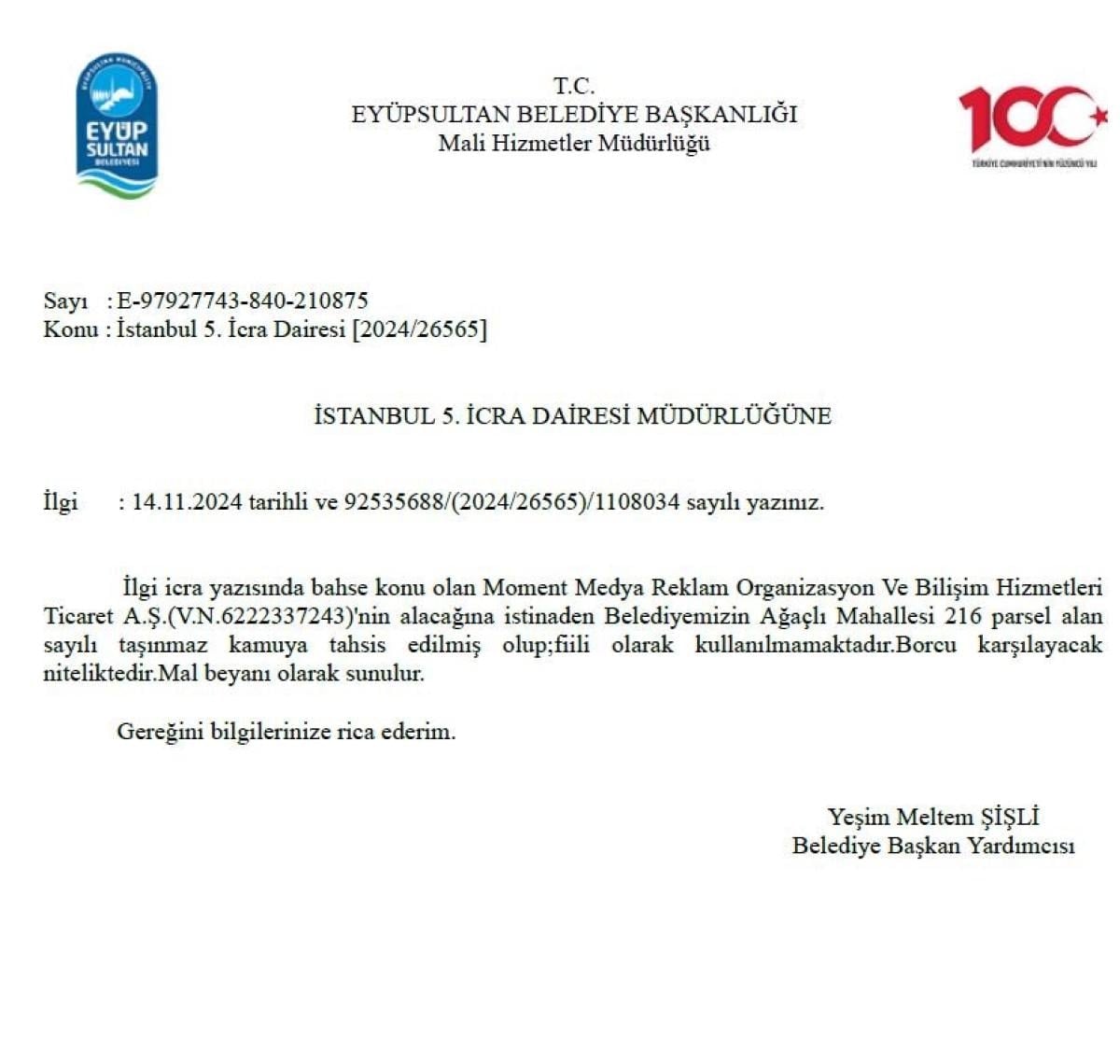 Eyüpsultan Belediyesi'nden alacaklı şirket sahibi Yılmaz Kurt'a borca karşılık 'Ağaçlık Mahallesi 216 parsel sayılı taşınmaz' gösterilerek, icraya verip satışının yapılabileceği söylendi.