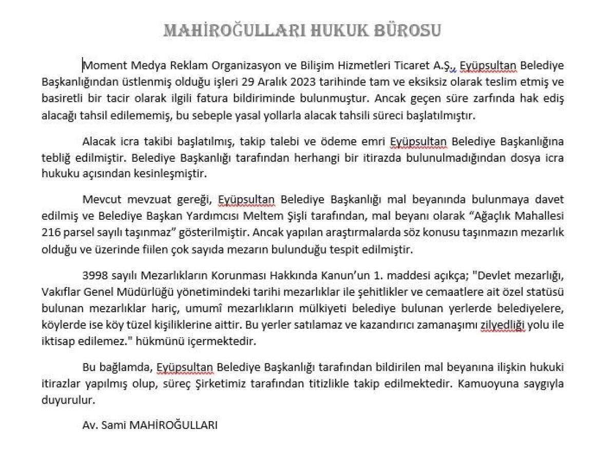 Eyüpsultan Belediyesi'nin borcuna karşılık mezarlık arazisi teklif ettiği şirketin sahibi Yılmaz Kurt, "Eyüpsultan Belediyesi'ne bir matbaa işi yaptım. İşleri teslim ettim. Ödeme istediğimde, ödemeye yanaşmadılar. Ben de avukatım vasıtasıyla almaya gittim. İcra takibi başlatmak için Eyüpsultan Belediyesi'nden mal beyanında bulunmasını istedim. Mal beyanı olarak da bana bu mezarlığı gösterdiler.
