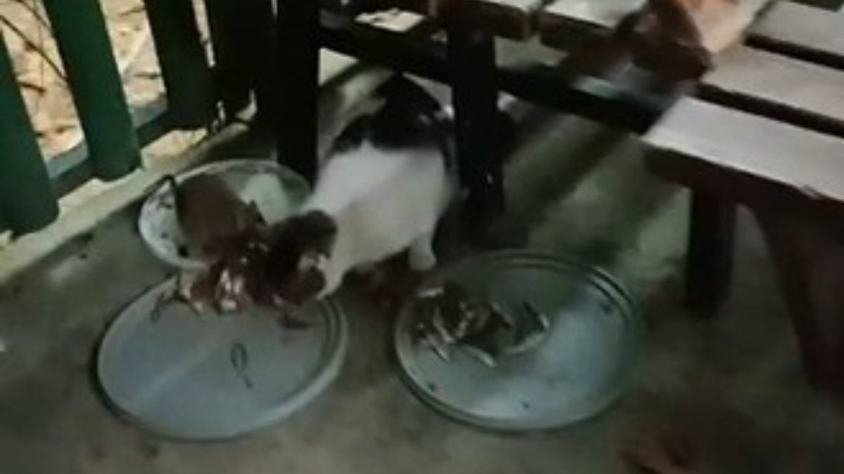 Yemeğini yiyen fareyi gören kedi, bir şey olmamış gibi yemeğini yemeye devam etti.
