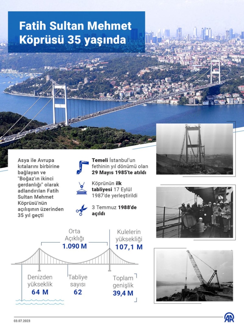 Adını İstanbul'un fethini gerçekleştiren Osmanlı padişahı Fatih Sultan Mehmet'ten alan ve 3 Temmuz 1988'de açılan köprü, 35 yılı geride bıraktı.