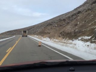 Kapısı açık kalan kamyondan kargolar bir bir yere düşmeye başladı. Araç sürücüsü durumdan habersiz yoluna devam ederken, videoyu kayda alan şahıs selektör yaparak kendisini uyardı.