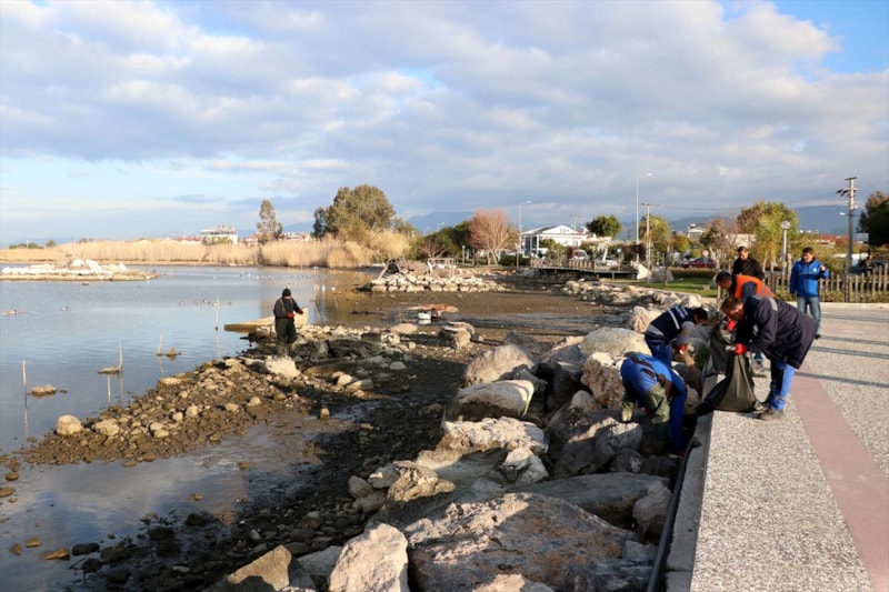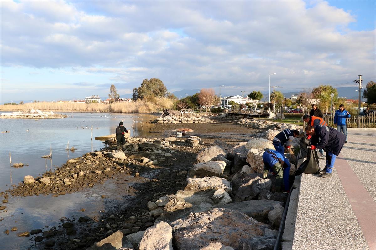 Çekilmenin ardından kıyıda beliren atıklar, Fethiye Belediyesi ekiplerince toplandı.