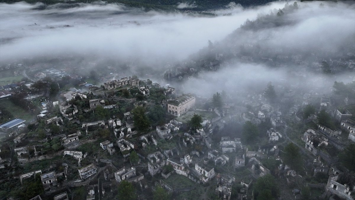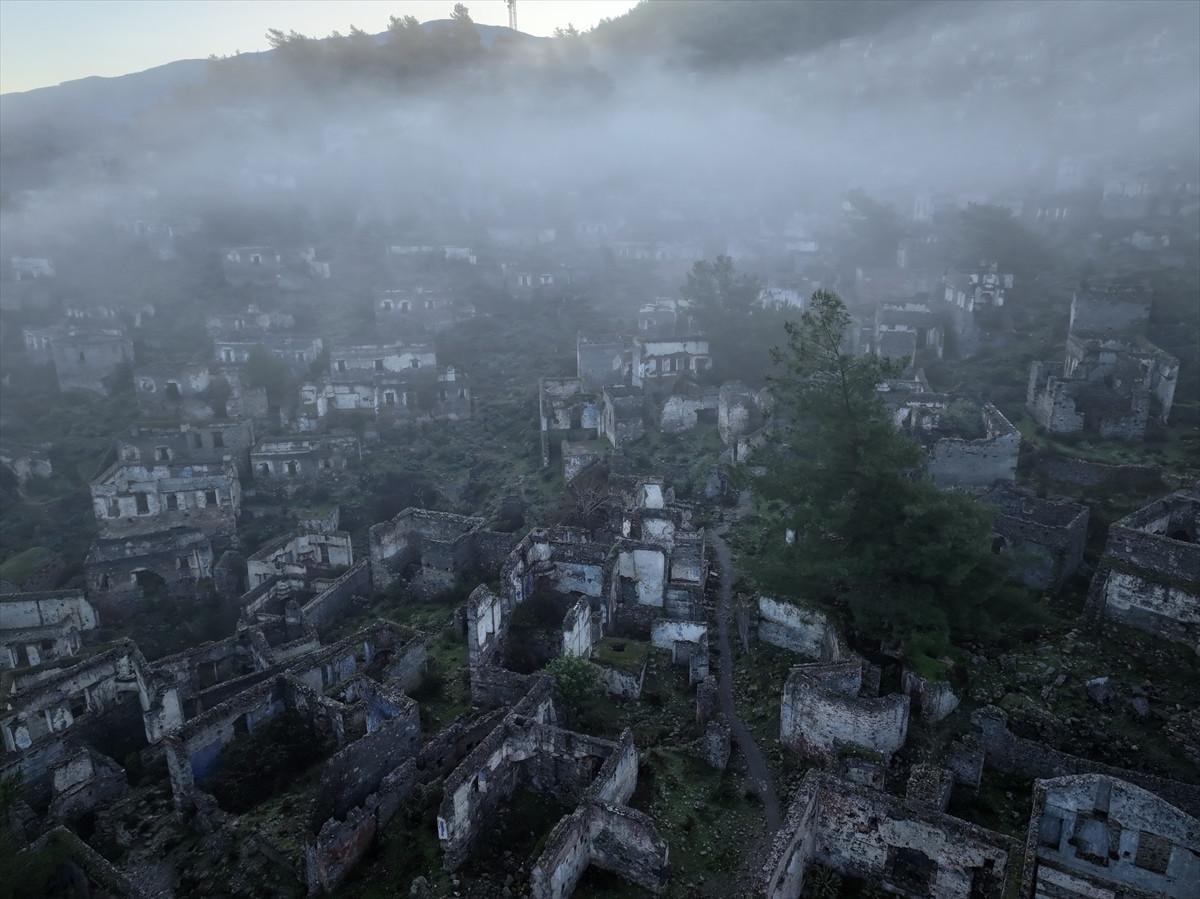 Havadan da görüntülenen Kayaköy, üzerine çöken sisle birlikte oluşan terk edilmiş, hüzünlü manzarasıyla ilgi odağı oluyor.
