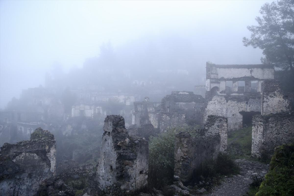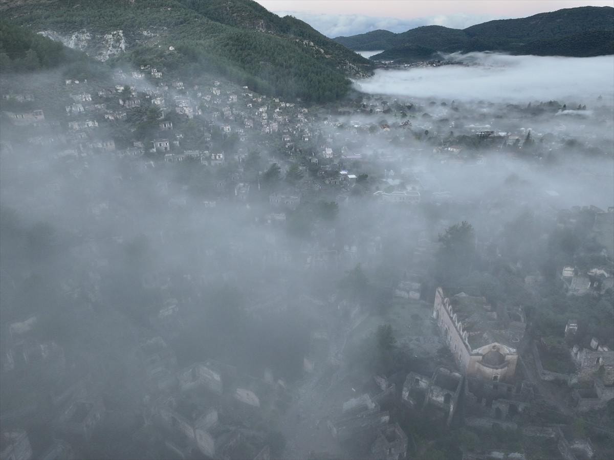 Muğla'nın Fethiye ilçesinde dün etkili olan yağışın ardından Kayaköy'deki evlerin üzerini sabahın ilk ışıklarıyla sis kapladı.