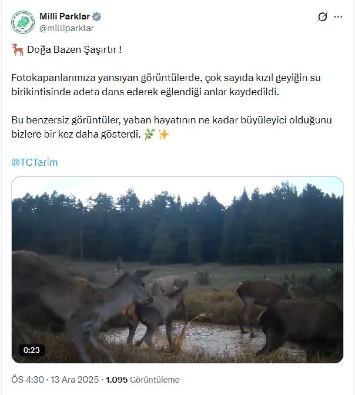 - Doğa Koruma ve Milli Parklar Genel Müdürlüğü'nün fotokapanlarına yakalanan görüntülerde, kızıl geyiklerin su birikintisi etrafındaki hareketleri izleyenleri etkiledi.