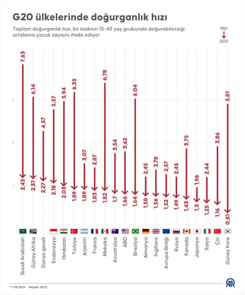 G20 ülkeleri arasında 1961 yılından 1921 yılına kadarki doğurganlık hızı istatistiği yayınlandı.