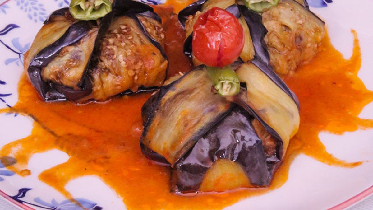 Kızartmalık yağı kızdırın ve uzun şeritler halinde kestiğiniz patlıcanların her iki yüzünü kızartın. Havlu kağıtta fazla yağını süzdürün ve orta noktaları üst üste gelecek şekilde 3'erli şekilde dizin. Orta kısmına pişen etten koyun ve uç kısımlarını ortada birleştirerek kapatın. Üzerine bir parça sivri biber ve çeri domates yerleştirip kürdanla tutturun. Tüm etleri aynı şekilde patlıcan şeritlerine sardıktan sonra fırın tepsisine yerleştirin.