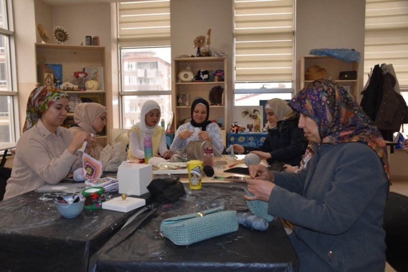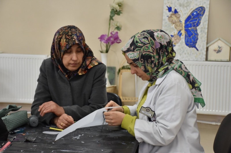 Cumhurbaşkanı Recep Tayyip Erdoğan’ın eşi Emine Erdoğan’ın himayelerinde yürütülen “Sıfır Atık” projesine katkı sunulan kursta; kumaş parçaları, karton ve cam şişe gibi atık malzemeler geri dönüşümle çanta ve dekoratif ürünlere dönüştürülüyor.