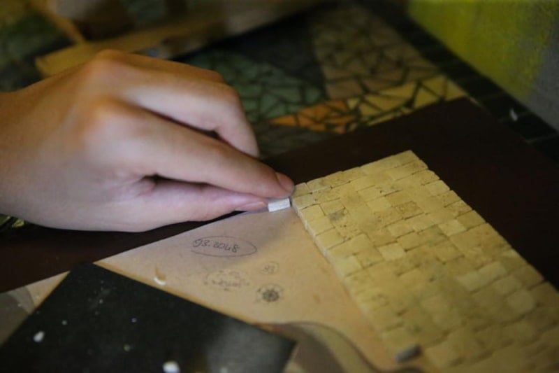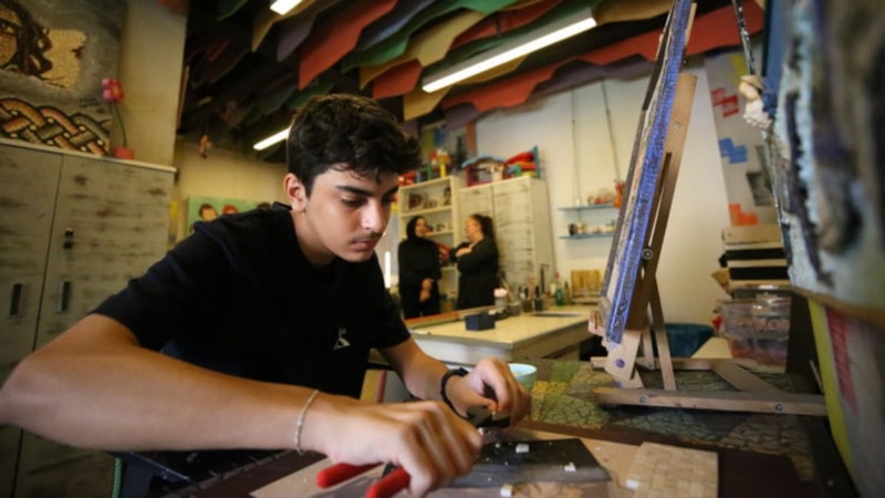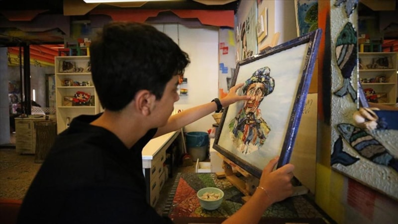 Ertuğrul burada 7 yıldır benimle beraber ve mozaik çalışmasına beraber başladık. Boncuktan, doğal taştan ve cam taştan tablolar yapmaya başladık. Ertuğrul'a renklerin resimdeki yeriyle doğal taştaki yerini göstererek belli oranlarda yapıştırmaya başladık. Böylelikle her seferinde kademeli bir şekilde eserleri tamamladık. Ertuğrul 7 yıl önce buraya geldiğinde renkleri karıştıran bir çocukken mozaik sanatıyla bu sorunu aştı.