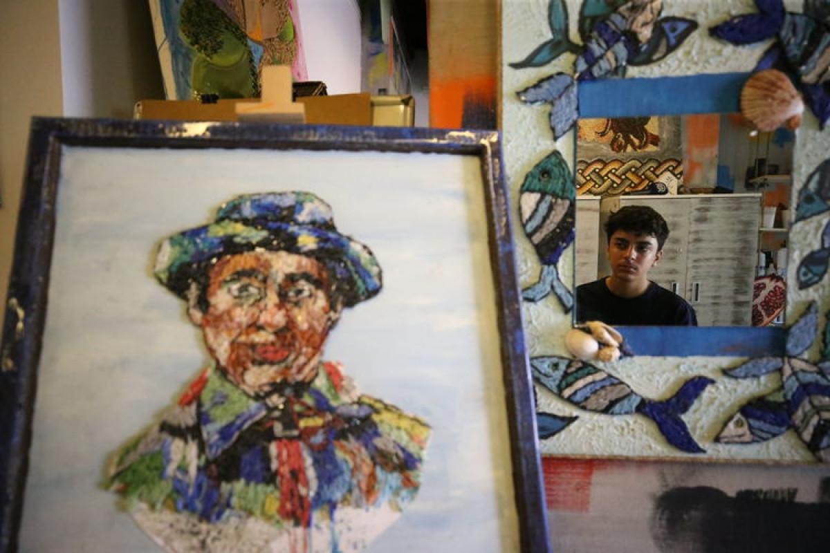 Ertuğrul'un öğretmeninin de yardımıyla yaptığı eserler, kurs gördüğü merkezde sergilendi.