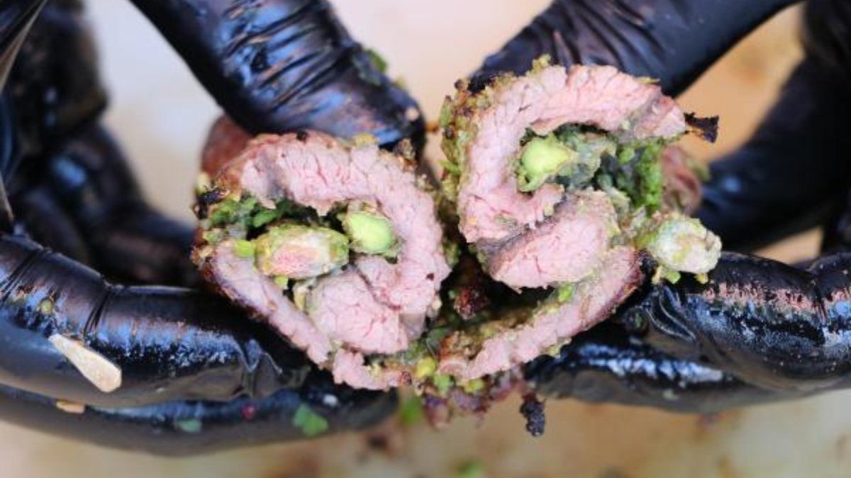 Dövülmüş kuzu etinin içine tane Antep fıstığı koyan Kılıçoğlu, daha sonra eti kekik, tuz, karabiber ve zeytinyağında marine ederek mangalda pişiriyor.