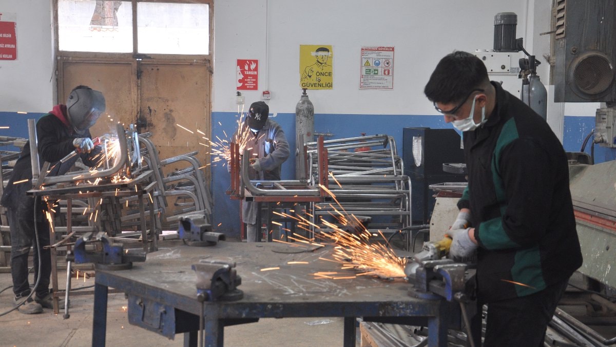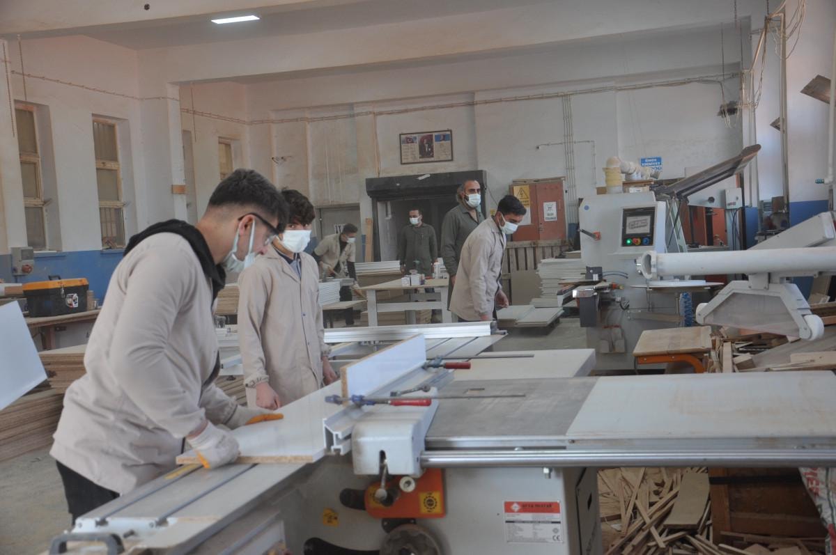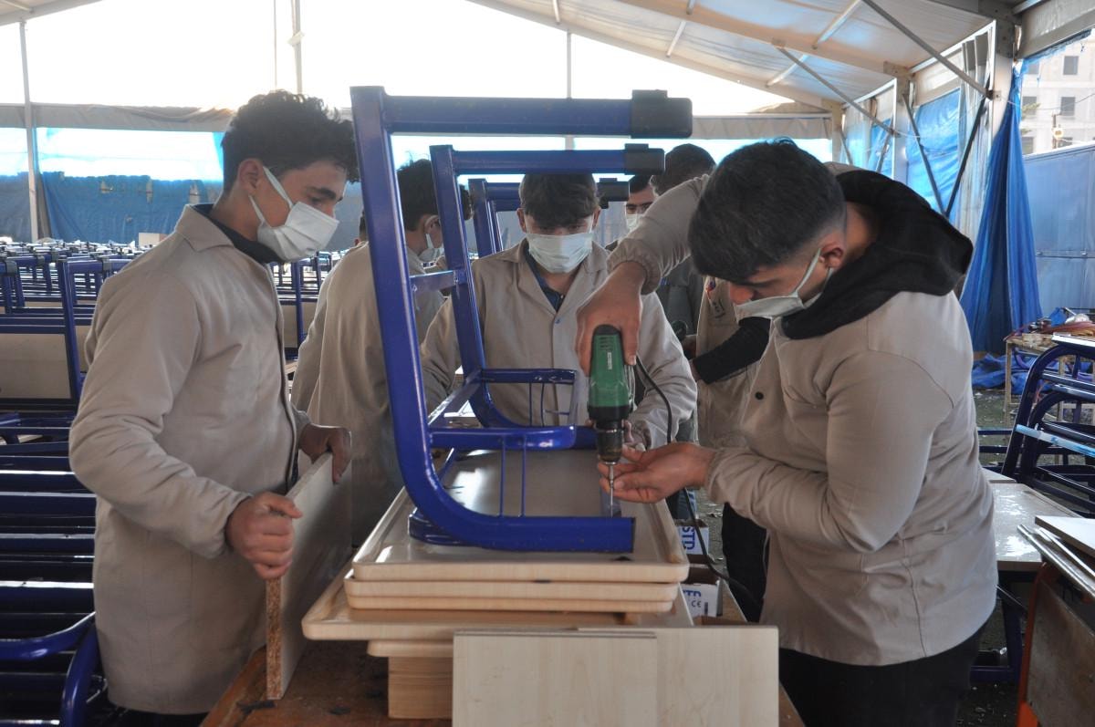Depremzede öğrenciler, ofis mobilyaları, okul sıraları ve ahşap oyuncaklar üretirken, yapılan masa ve dolaplar deprem bölgesindeki yenilenen okullara gönderiliyor.