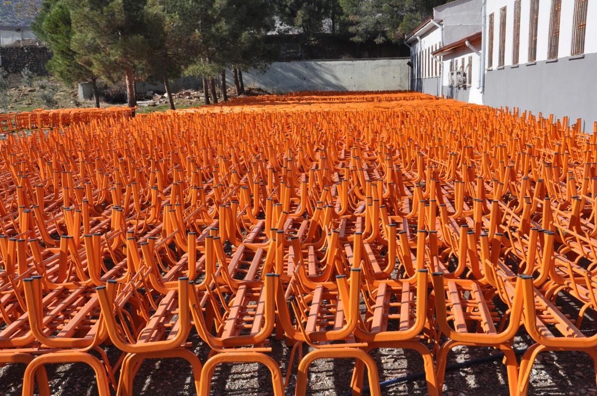 Bu okulda 27 öğretmen ve 380 öğrenci, bahçedeki halı sahayı atölyeye dönüştürerek mobilya üretmeye başladı.
