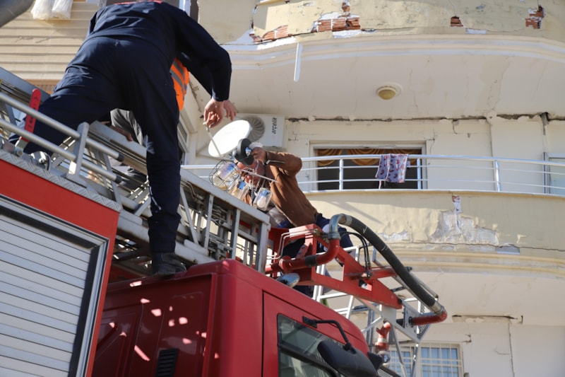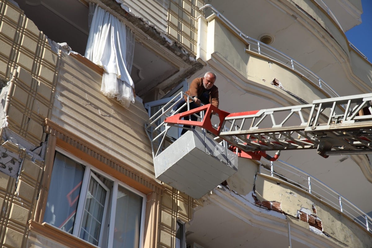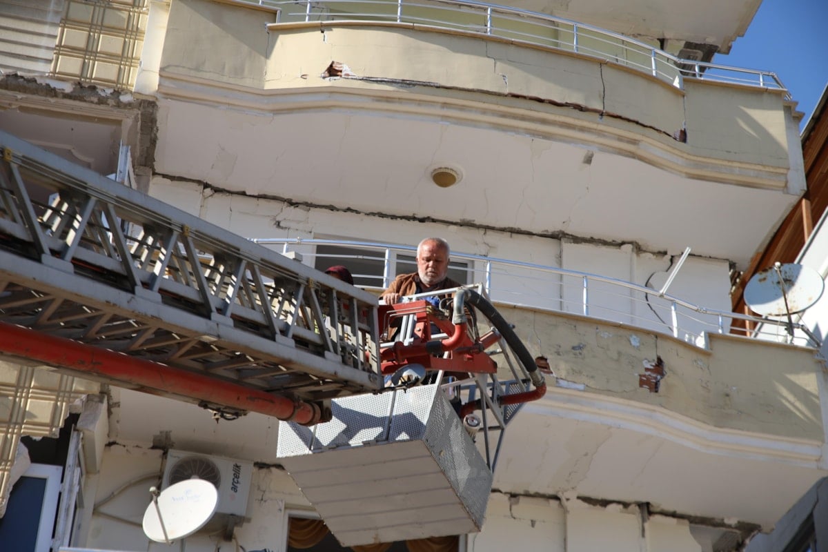 Bölgeye gönderilen merdivenli kurtarma aracı ayakta zor duran binaya yanaşıp adam ve eşini binadan çıkardı.