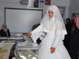 Manisa'nın Kırkağaç ilçesinde oy kullanmaya gelen gelin de ilgi odağı oldu. Gelin alma töreni öncesi oy kullanacağı sandığa gelen gelin Hacer Lenk, "Hem benim için hem de vatanım için hayırlı olsun" dedi. Damat Yusuf Şahin ise müstakbel eşini almak için kız evinde bekledi.