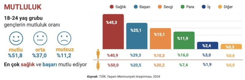 TÜİK'in "İstatistiklerle Gençlik 2024" araştırmasına göre, mutlu olduğunu beyan eden 18-24 yaş grubundaki gençlerin oranı yüzde 51,8 olarak belirlendi. Gençlerin mutluluğun, 2024’te en çok yüzde 45,3 oranında sağlık faktöründen kaynaklandığı görüldü.