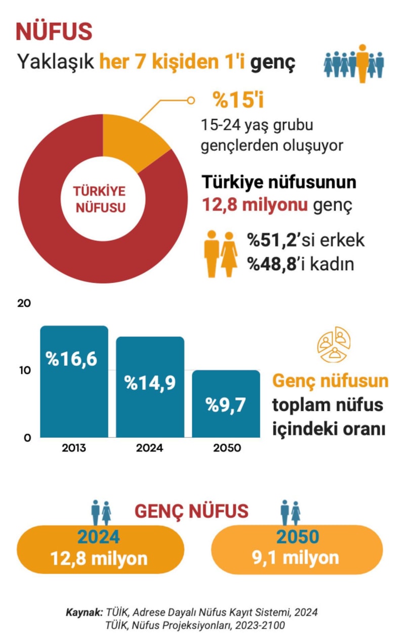 Türkiye İstatistik Kurumu'nun "İstatistiklerle Gençlik 2024" araştırmasına göre, nüfusun yüzde 14,9'unu 15-24 yaş grubundaki genç nüfus oluşturdu.