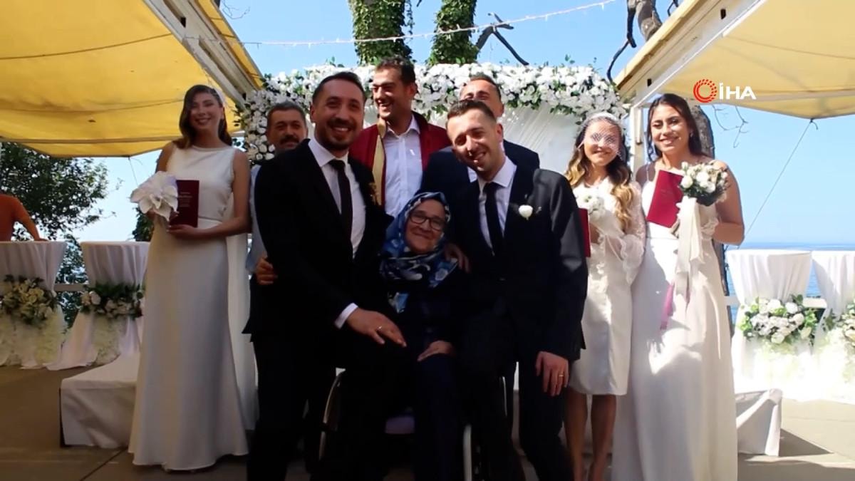 Nikâh sonrası tekerlekli sandalyede oturan annelerinin kucağına oturarak fotoğraf çektiren üç kardeş, duygu dolu anların yaşanmasına sebep oldular.