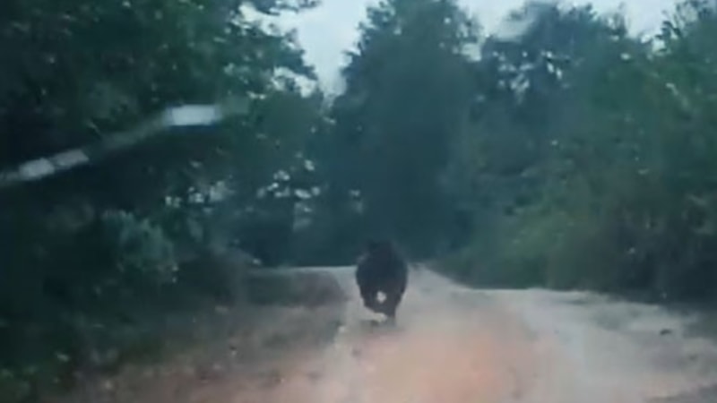 Bir sürücünün aracıyla önüne çıkan ayıyı kovaladığı anlar cep telefonu kamerasıyla görüntülerken ayı, kovalamacanın ardından ormanlık alana kaçarak gözden kayboldu.