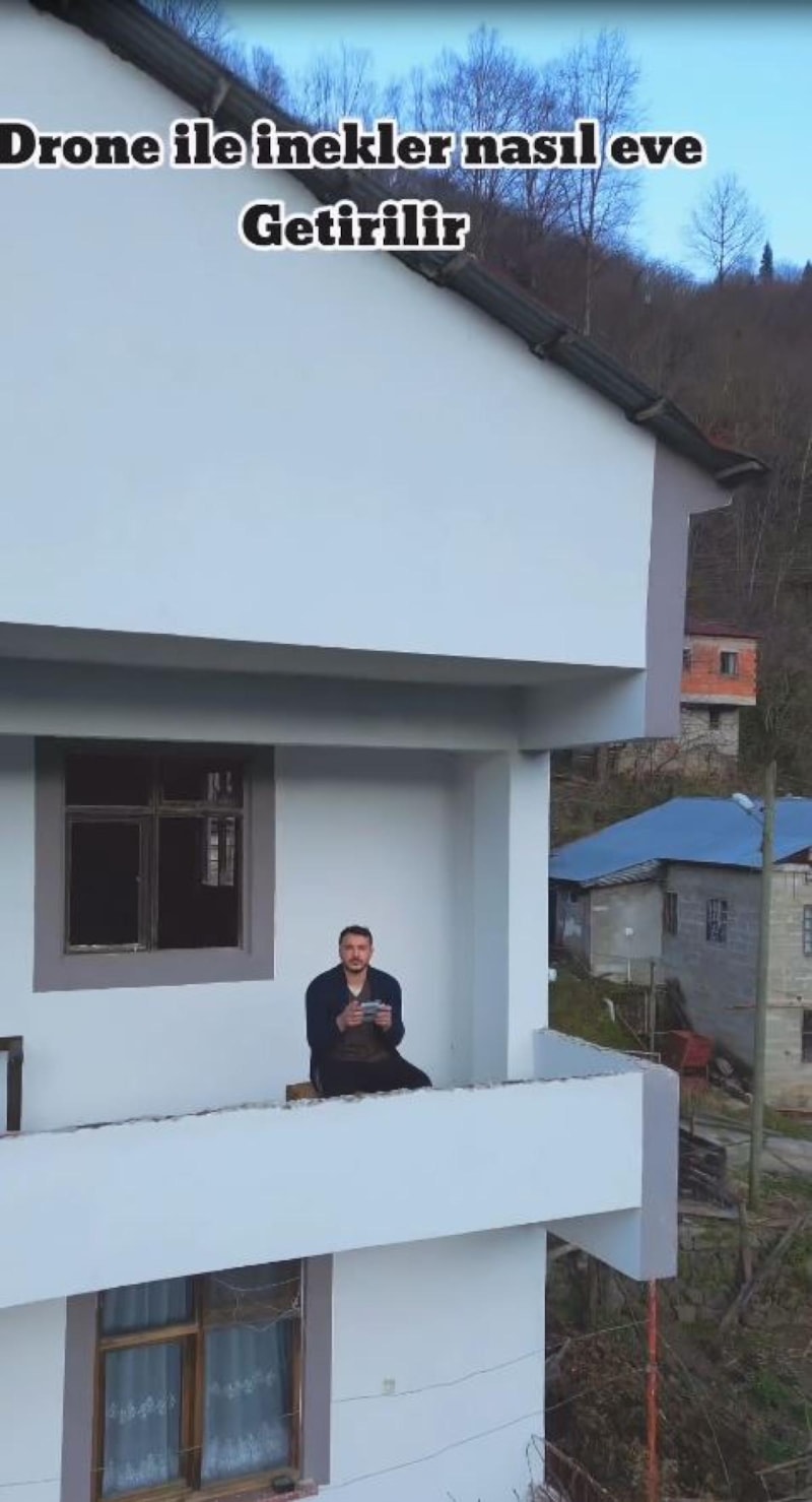 Direksiyon eğitmeni Faruk İlyasoğlu'nun, balkondan komuta ettiği drone ile otlayan büyükbaş hayvanları ahıra getirdiği görüntüler, sosyal medyada ilgi gördü.