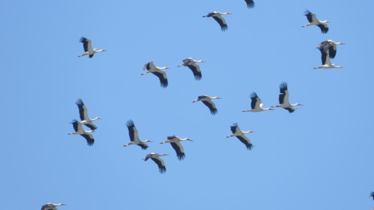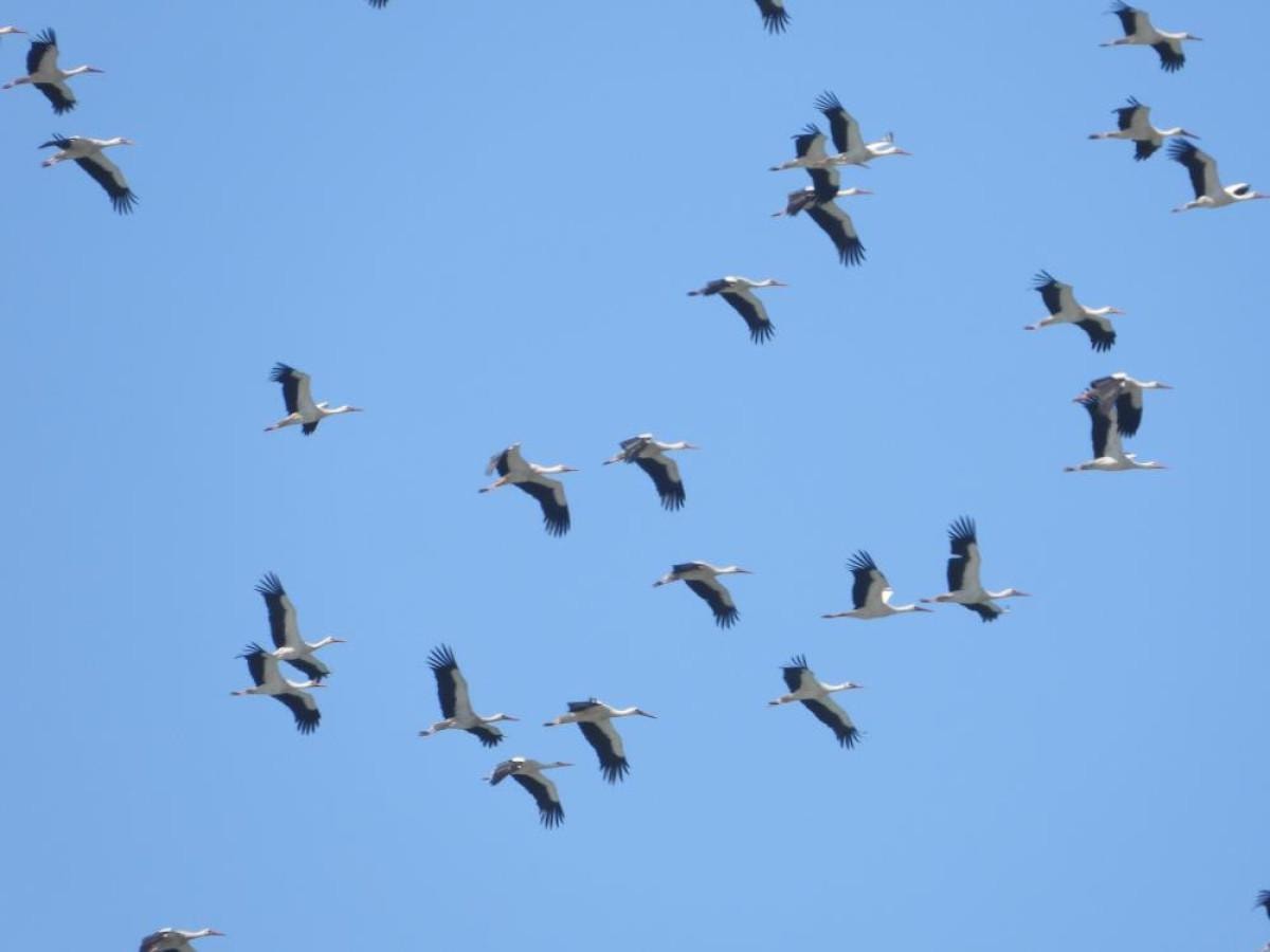 Müthiş bir leylek göçü var şu an, binlercesi geliyor. Her sene bu zamanlarda buradan geçiyorlar. Daha önce burada dinleniyorlardı ama şu an durmadılar, yollarına devam ettiler, çok güzel bir manzara.