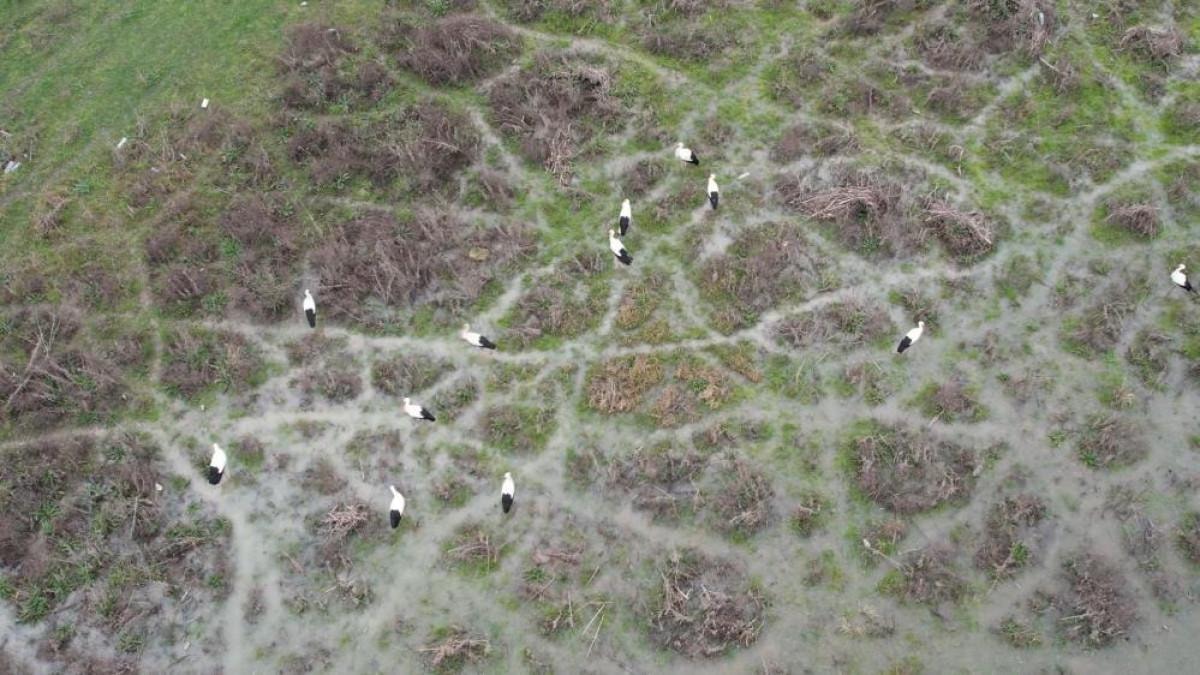 Leylekler drone ile havadan görüntülendi. Görüntülerde sürüler halindeki leyleklerin baraj kıyısında mola verdiği görüldü.