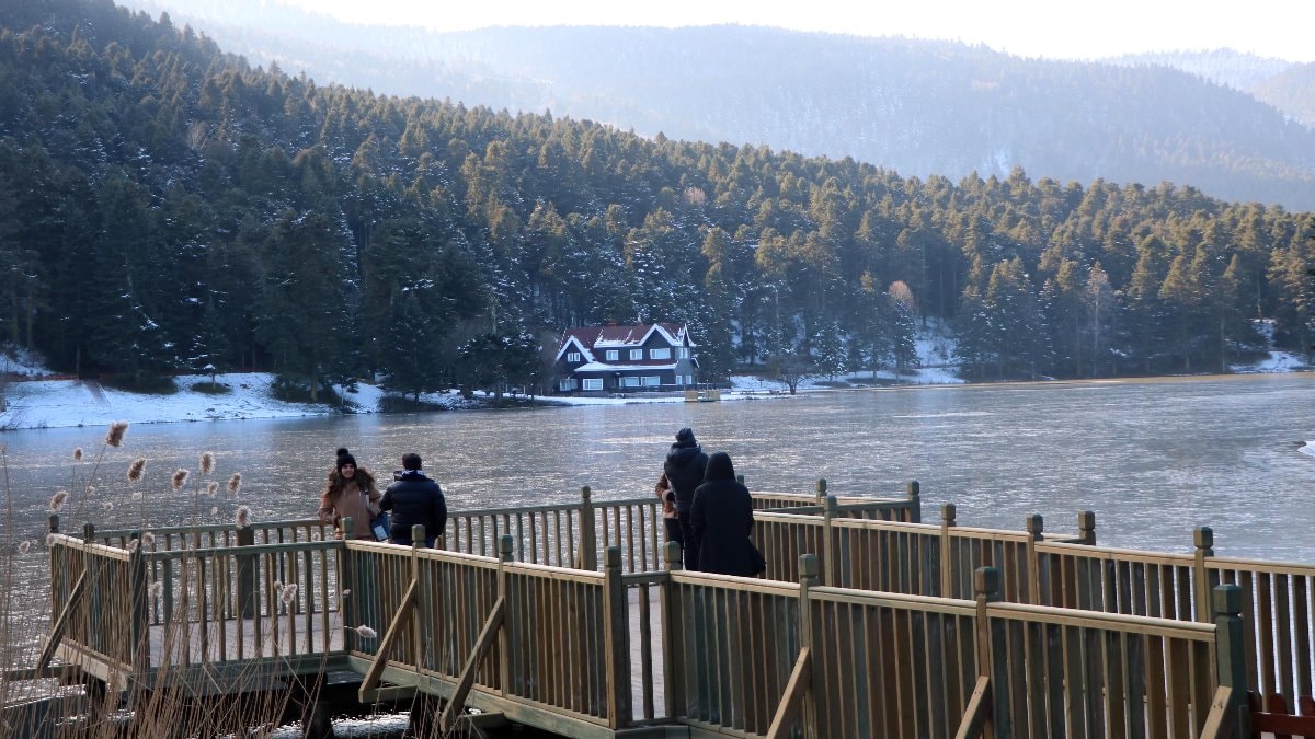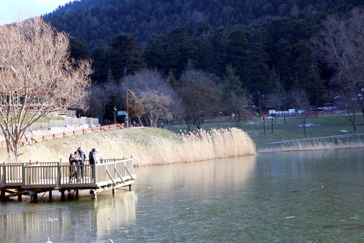 Soğuk havaya rağmen tabiat parkına gelen az sayıda tatilci, buz tutan gölle birlikte oluşan manzarada bol bol fotoğraf çekti.