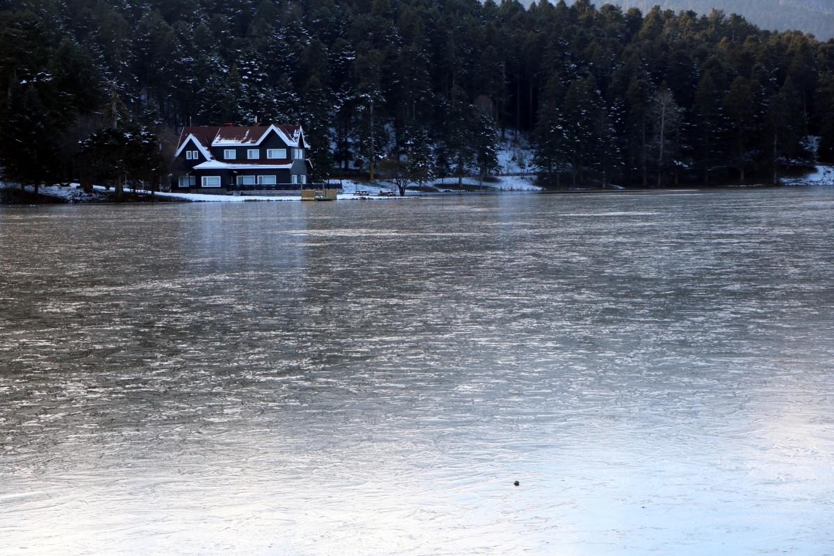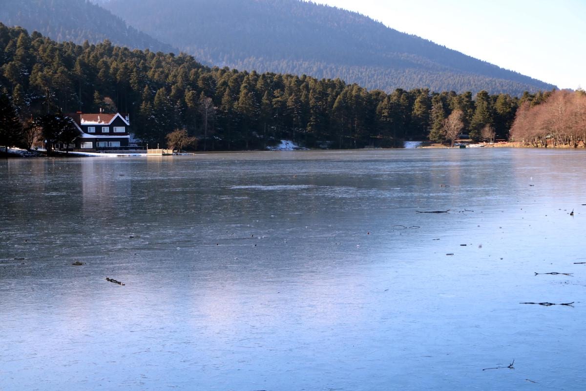 Dondurucu soğuklar nedeniyle çam ormanları bulunan Gölcük Tabiat Parkı'nda bulunan göl dondu.