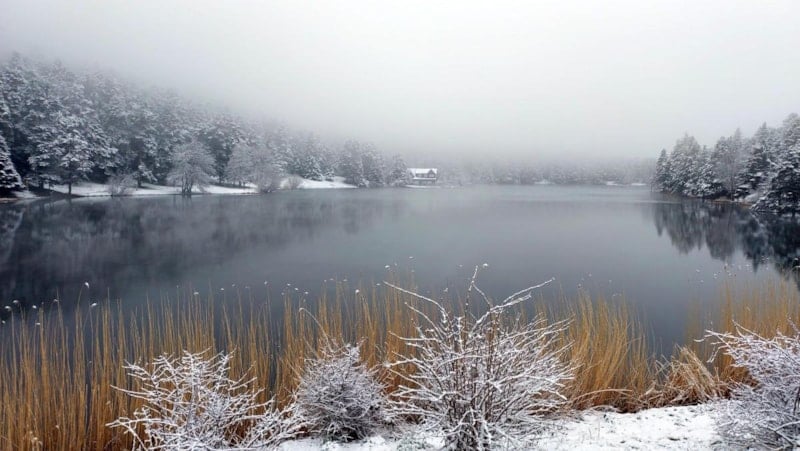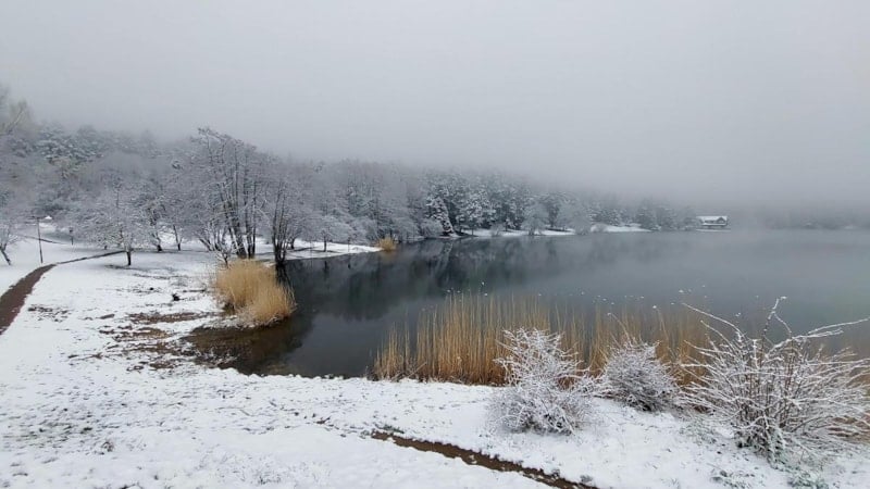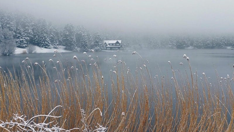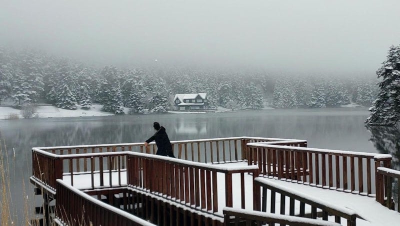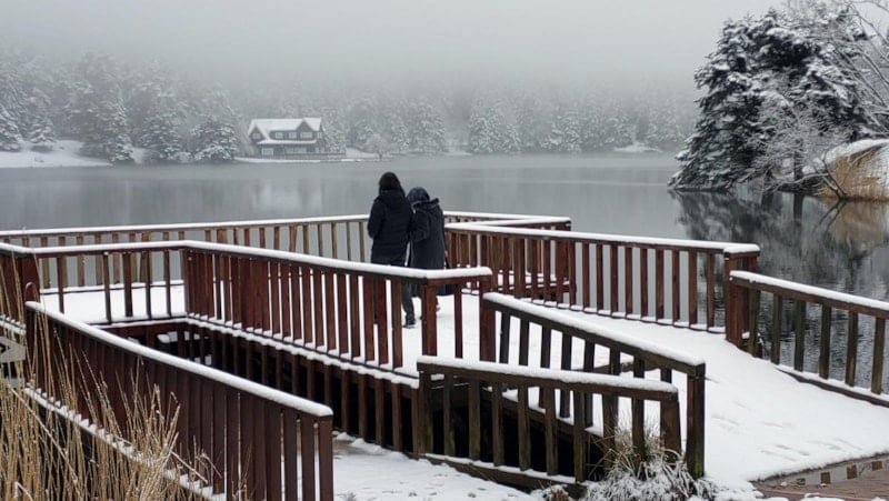 Bolu'da, çam ormanlarının arasındaki doğa harikası Gölcük Tabiat Parkı, kar yağışıyla beyaza büründü.