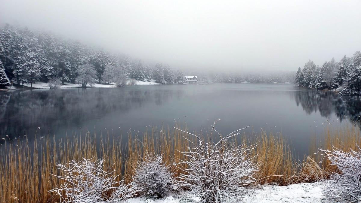 Çevresi çam ormanları ile kaplı doğa harikasında kar kalınlığı 5 santime ulaştı.