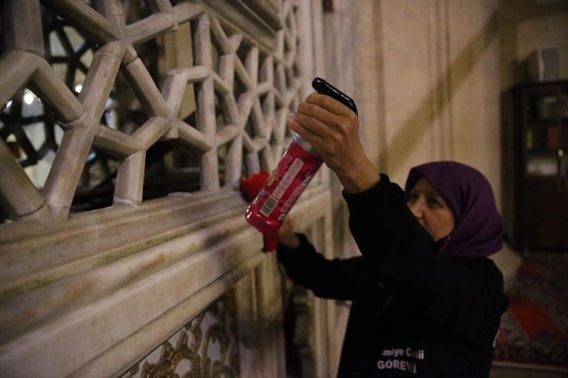 Minber ve mihraplar da aynı özenle gül suyuyla temizlenerek ibadet alanlarına ferahlık kazandırıldı.
