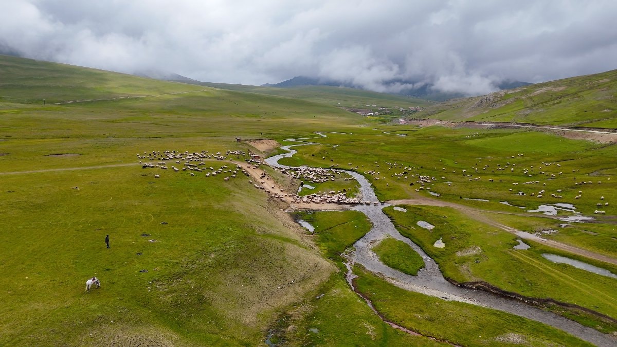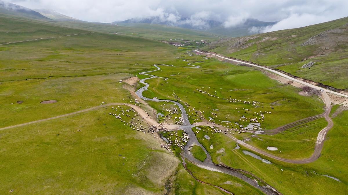 Drone kamerasıyla kaydedilen görüntülerde, yılan gibi kıvrılan menderesler ve bu akarsuların etrafında farklı tonlarda yeşil bitki örtüsünün oluşturduğu halımsı doku dikkat çekiyor. Özellikle kuşbakışı bakıldığında, beyaz koyunlar hareket eden kar tanelerini andırırken, pastoral görünüm adeta izleyenleri doğanın büyüsüne çekiyor.